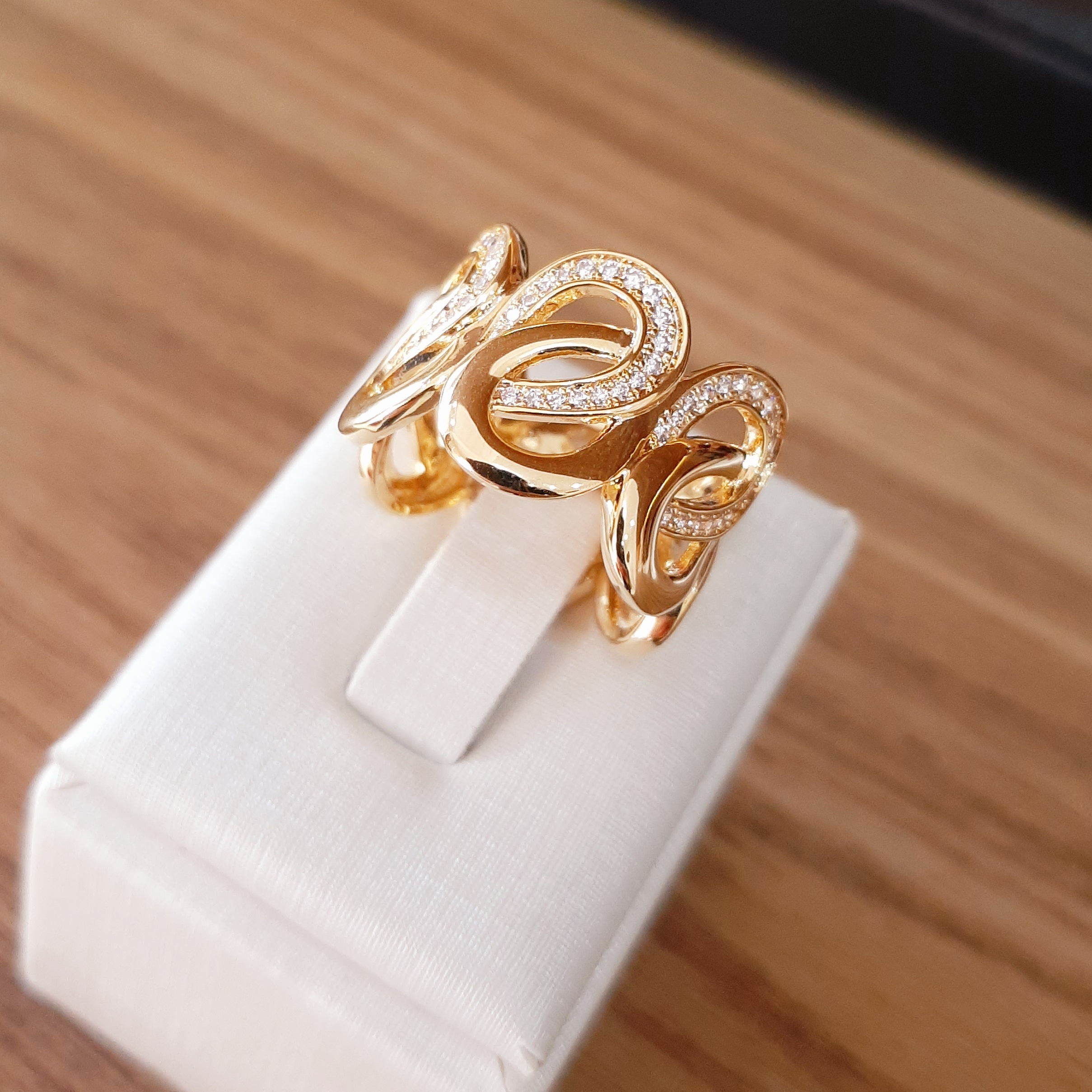 Anel largo vazado com detalhes em zircônias.